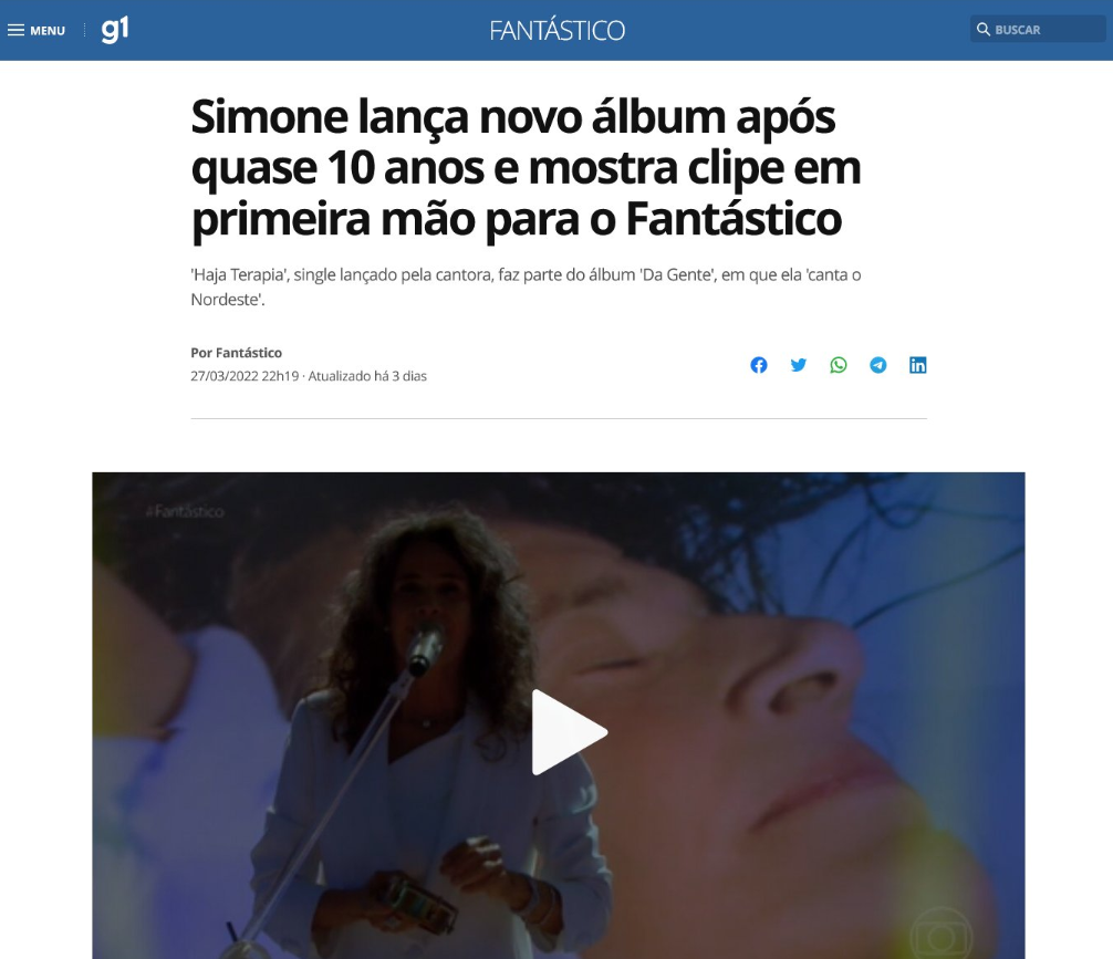 Simone lança novo álbum após quase 10 anos e mostra clipe em primeira mão para o Fantástico